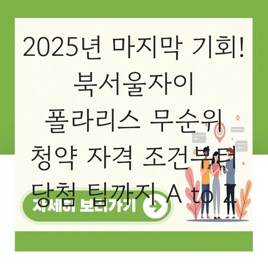 - 자격 조건 명확히 파악: 신청 전에 반드시 북서울자이 폴라리스 무순위 청약 자격 조건을 모집공고문에서 꼼꼼하게 확인하세요. 자격 미달로 인한 당첨 취소는 시간 낭비입니다.