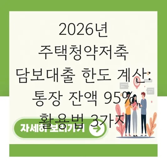 2026년 주택청약저축 담보대출 한도 계산: 통장 잔액 95% 활용법 3가지 갑작스러운 목돈이 필요할 때, 주택청약통장을 깨야 하나 고민하는 분들이 많습니다. 오랜 기간 공들여 모은 청약통장은 단순한 저축을 넘어 …