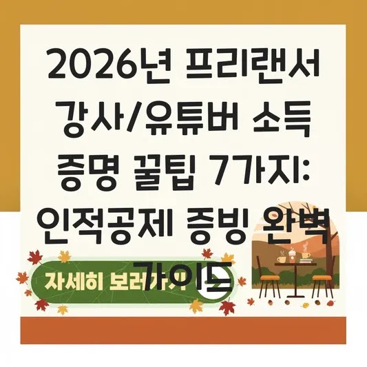 2026년 프리랜서 강사/유튜버 소득 증명 꿀팁 7가지: 인적공제 증빙 완벽 가이드 프리랜서 강사나 유튜버로 활동하며 3.3% 사업소득세를 내는 분들이 가장 헷갈리는 부분이 바로 ‘소득 증명’입니다. 일반 직장인(…